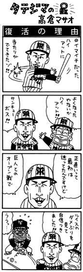 ★ 高倉 マサオ(高倉 誠雄)昭和34年10月20日生まれ、37歳。千葉県出身。帝京大学文学部在籍中の21歳の時、双葉社「100てんコミック」のギャグ漫画で、漫画家としてデビュー。大の阪神ファン。「今年の阪神?Aクラスかな」「個人としては新庄、檜山に期待している。」